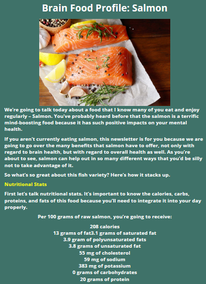 -Fatty fish, such as salmon, trout, and sardines contain omega-3 fatty acids. Omega-3 helps to build brain and nerve cells, which are food for learning and remembering. They may even slow age-related mental decline and keep out depression.